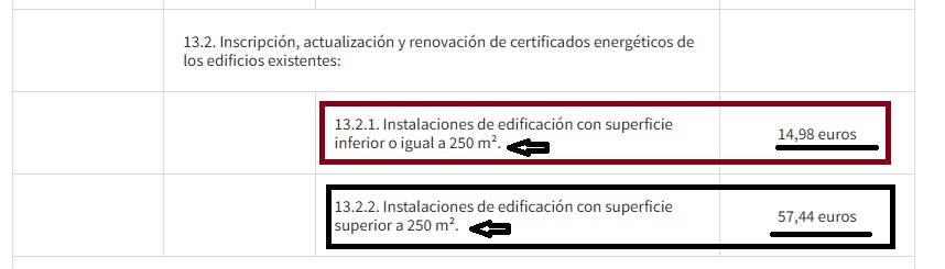 Para la obtención del registro del Certificado Energético para edificios, locales y oficinas la Junta de Andalucía exige el pago de una tasa, que asciende a 14,98€ para superficies construidas por debajo de 250 metros y 57,44€ para superficies mayores a 250 metros.